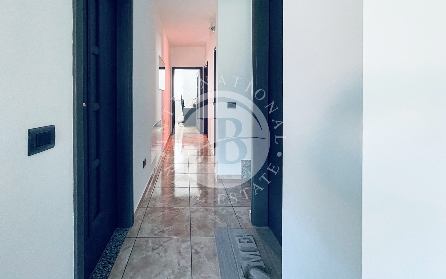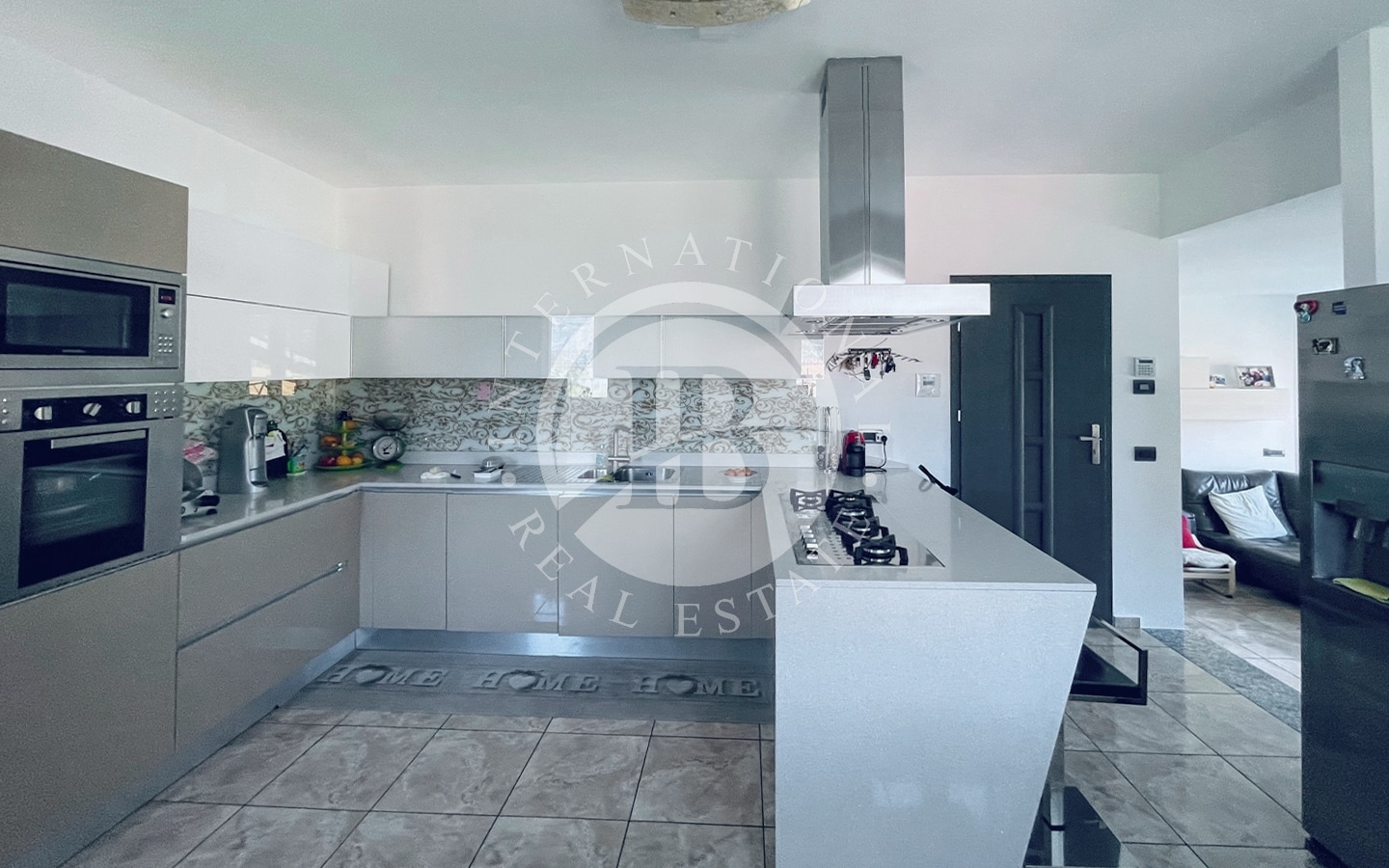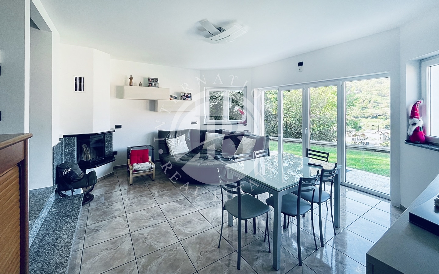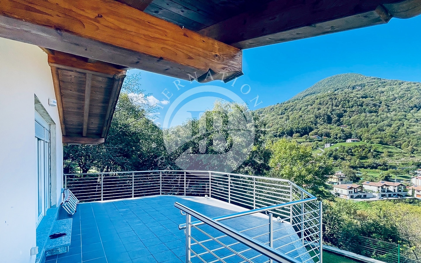 seminterrato si trovano un ampio garage, il locale tecnico, la cantina, un magazzino, la lavanderia con doccia e una scala interna di collegamento. Il piano terra ospita un luminoso soggiorno con camino e ampia vetrata panoramica, una cucina con zona pranzo, due camere da letto, due bagni, un guardaroba e un disimpegno. Il piano primo è dedicato alla camera padronale con bagno dotato di idromassaggio, locale guardaroba e accesso a un ampio terrazzo e a un balcone.