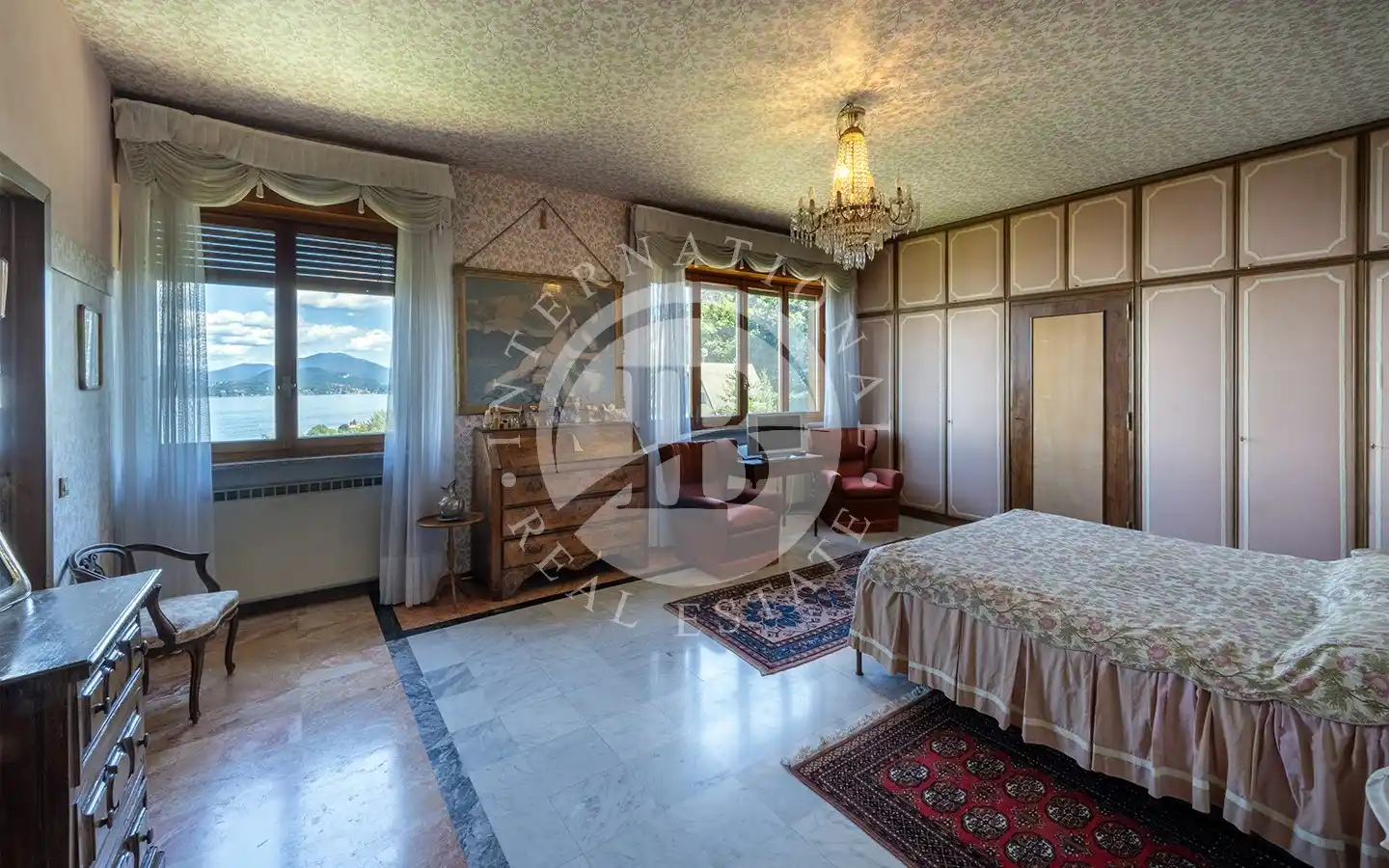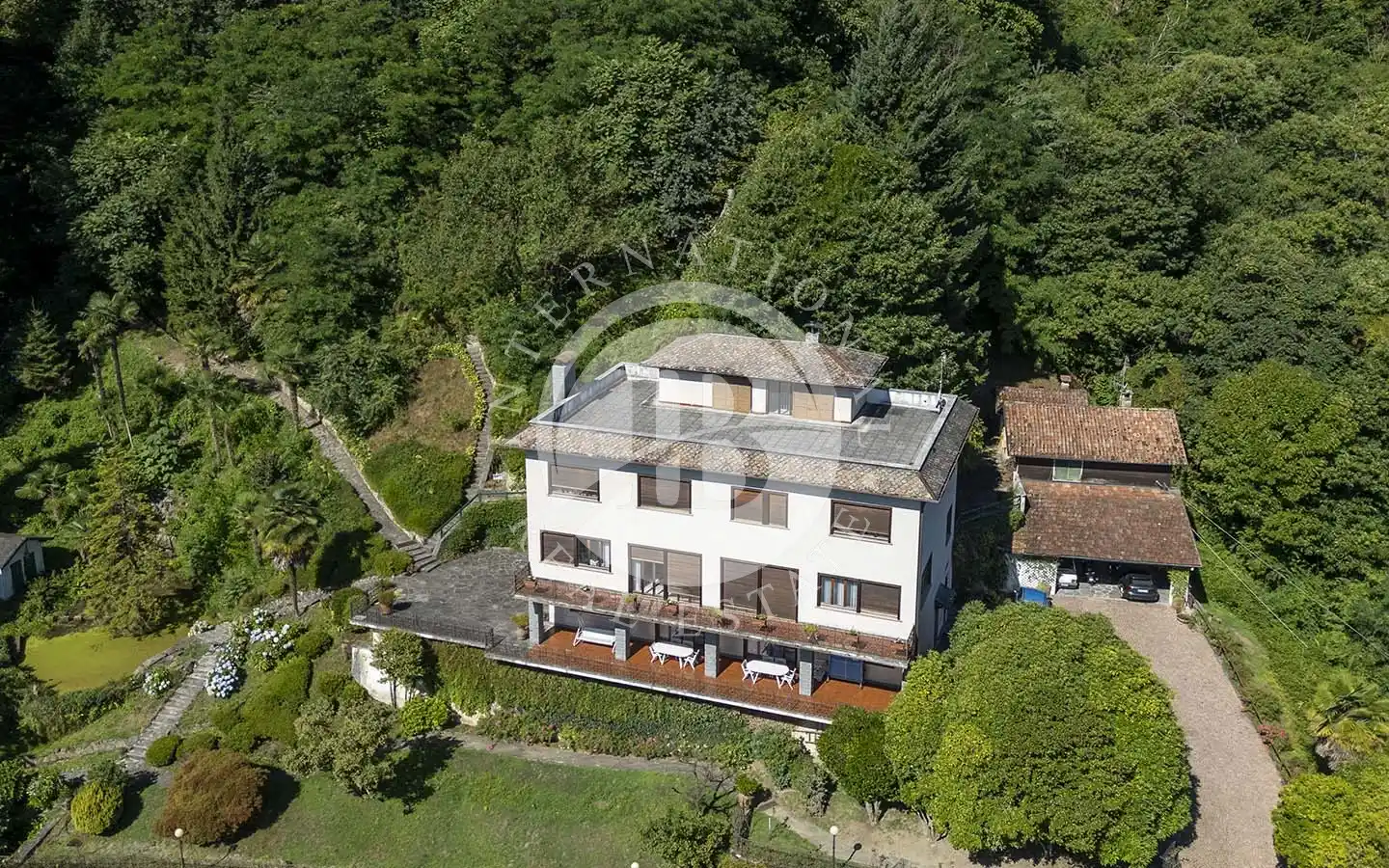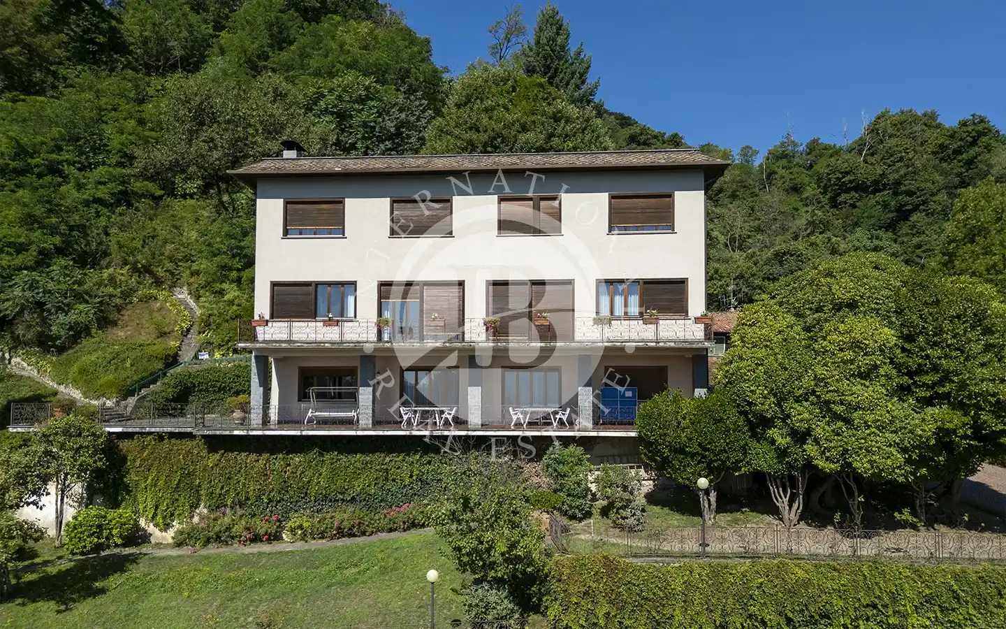 Costruita negli anni ’60 e riqualificata nel 1983, la villa si sviluppa su quattro livelli armoniosamente collegati. Al piano giardino si trovano l’ingresso, la sala da pranzo, la cucina, una camera, due bagni e i locali di servizio; da qui si accede a un ampio terrazzo porticato affacciato sul lago, perfetto per vivere all’aperto in ogni stagione. Il primo piano ospita un grande soggiorno open space di oltre 200 metri quadrati, caratterizzato da ampie vetrate e da un balcone panoramico che regala una vista spettacolare sul Lago Maggiore. Al secondo piano si sviluppa la zona notte, composta da cinque camere da letto e cinque bagni, mentre il terzo piano accoglie un’ampia terrazza di copertura completamente fruibile, con un piccolo fabbricato accessorio dotato di guardaroba e bagno, ideale come area relax o spazio per gli ospiti.