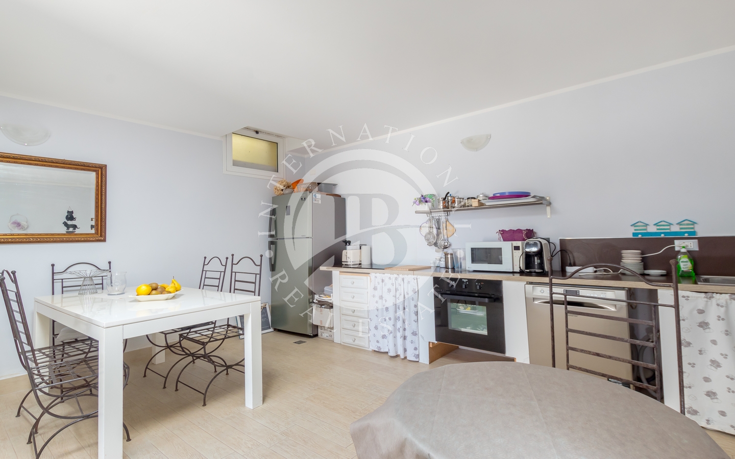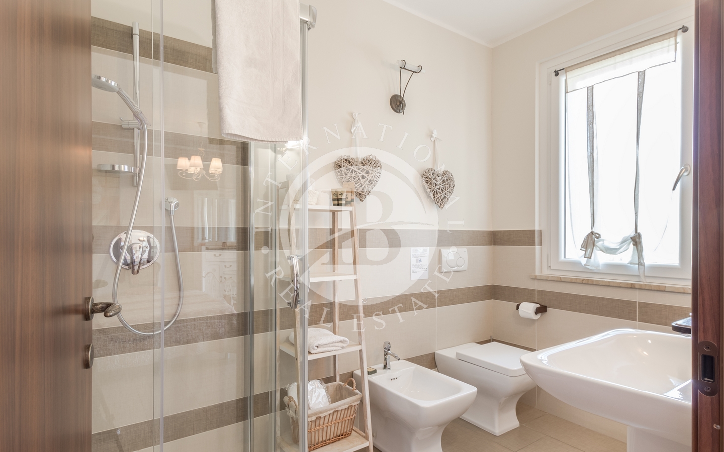 L’area esterna comprende un giardino di dimensioni generose con un pergolato, ideale per momenti all’aperto. La piscina, dotata di un sistema di depurazione ecologico a base di potassio e magnesio, è circondata da uno spazio verde attrezzato con solarium e un secondo pergolato con cucina esterna.