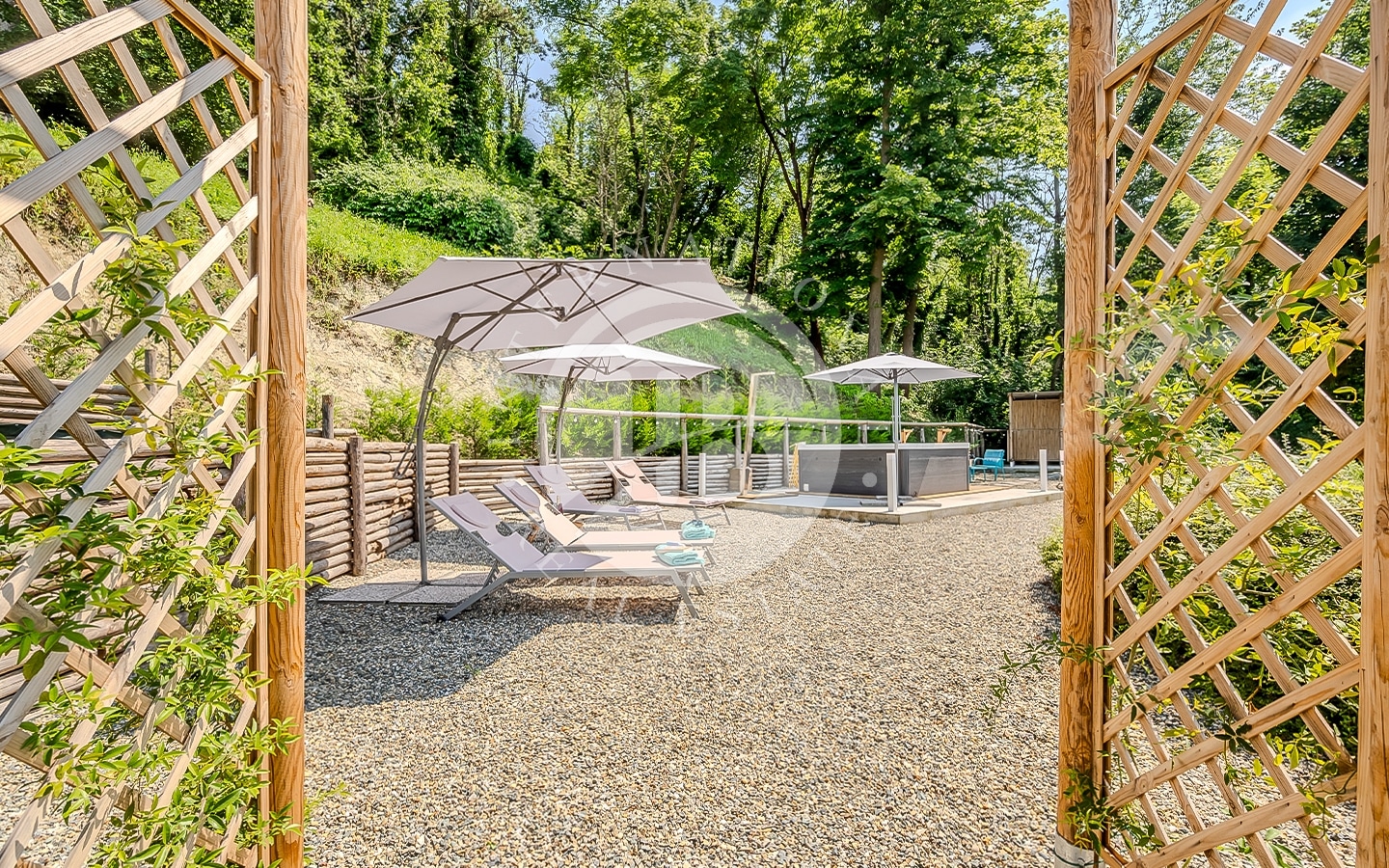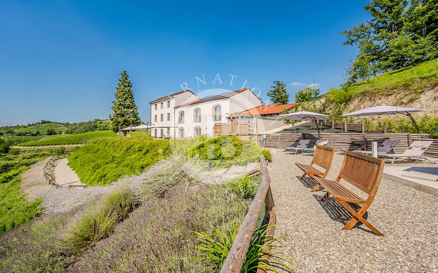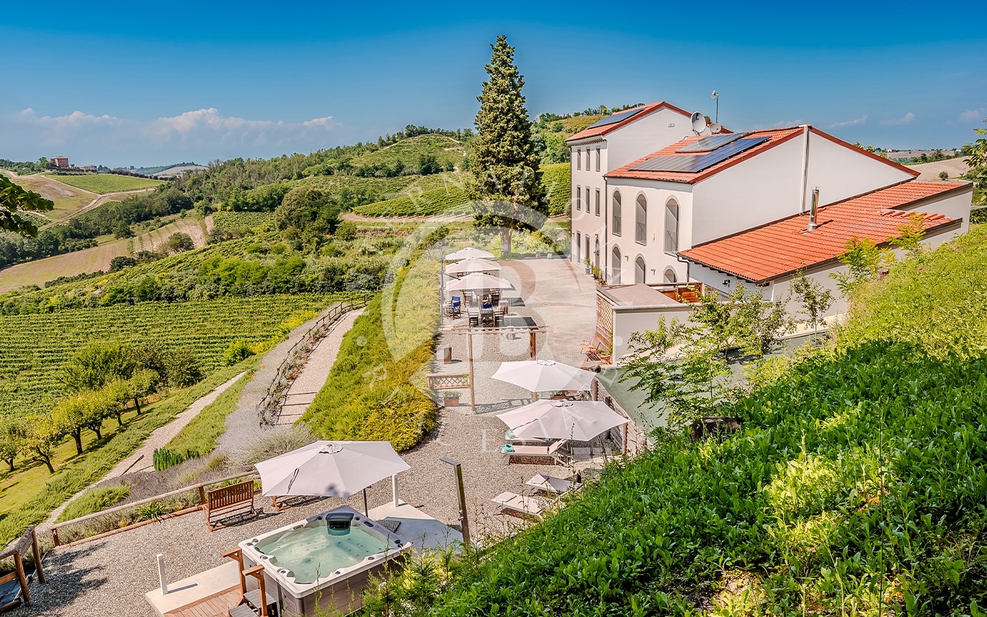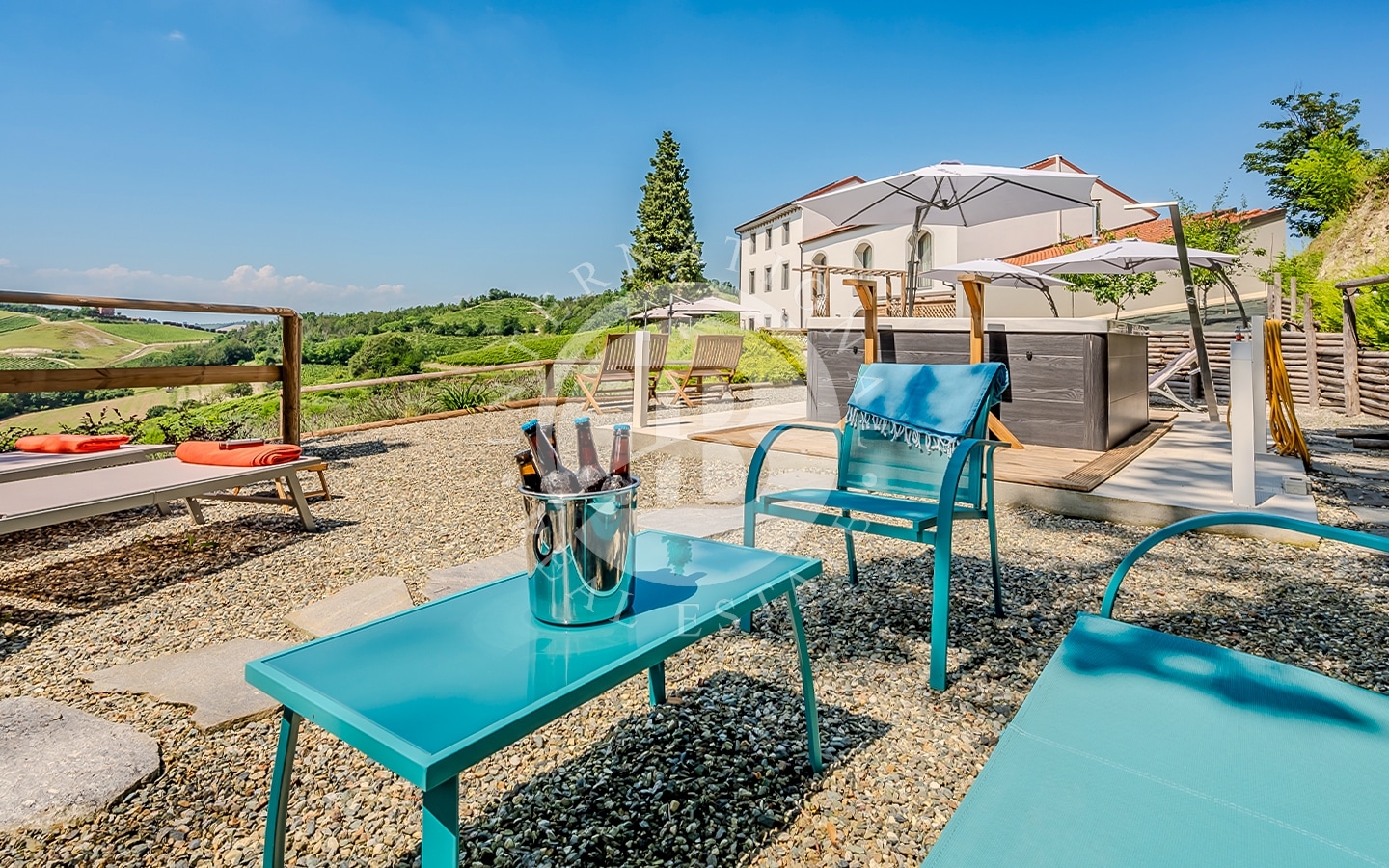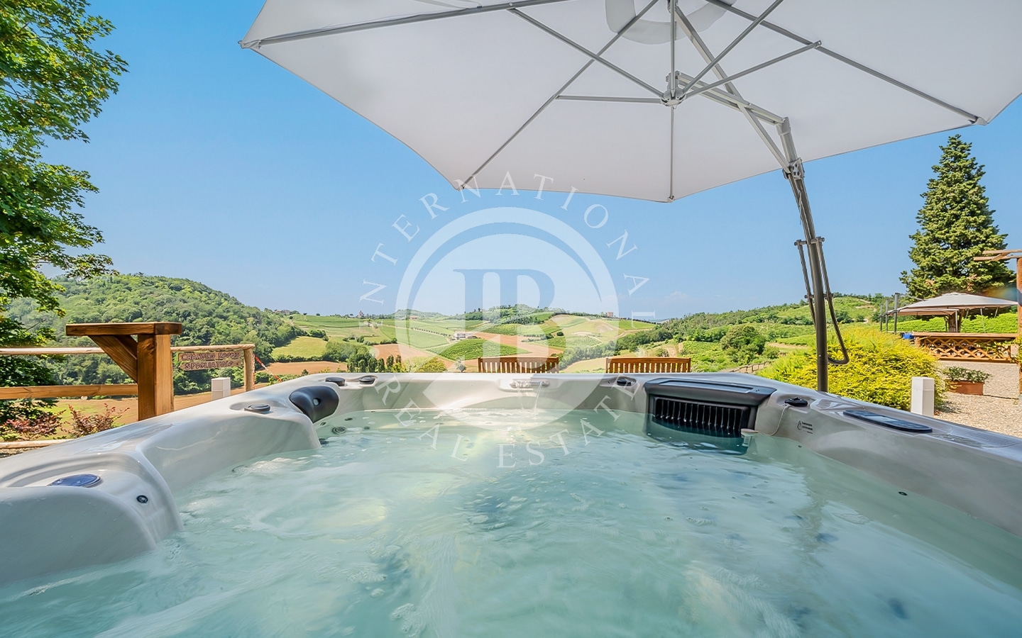 La proprietà è immersa in circa un ettaro di terreno, circondata da vigneti accuratamente curati che trasmettono un senso di pace e serenità. I panorami offrono una vista su dolci colline, vigneti che si estendono a perdita d’occhio e boschi incontaminati creando un’atmosfera unica di tranquillità. La jacuzzi esterna, situata in una zona privata del giardino, offre un'esperienza di lusso, permettendo di immergersi nell’acqua con vista panoramica sui vigneti.