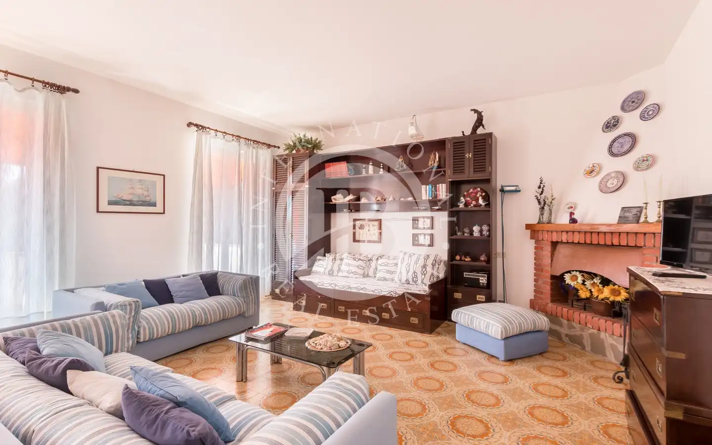 Al primo piano, raggiungibile con una scalinata direttamente dal giardino, troviamo il secondo appartamento con ingresso su zona living con camino, cucina, due camere ed un bagno.
