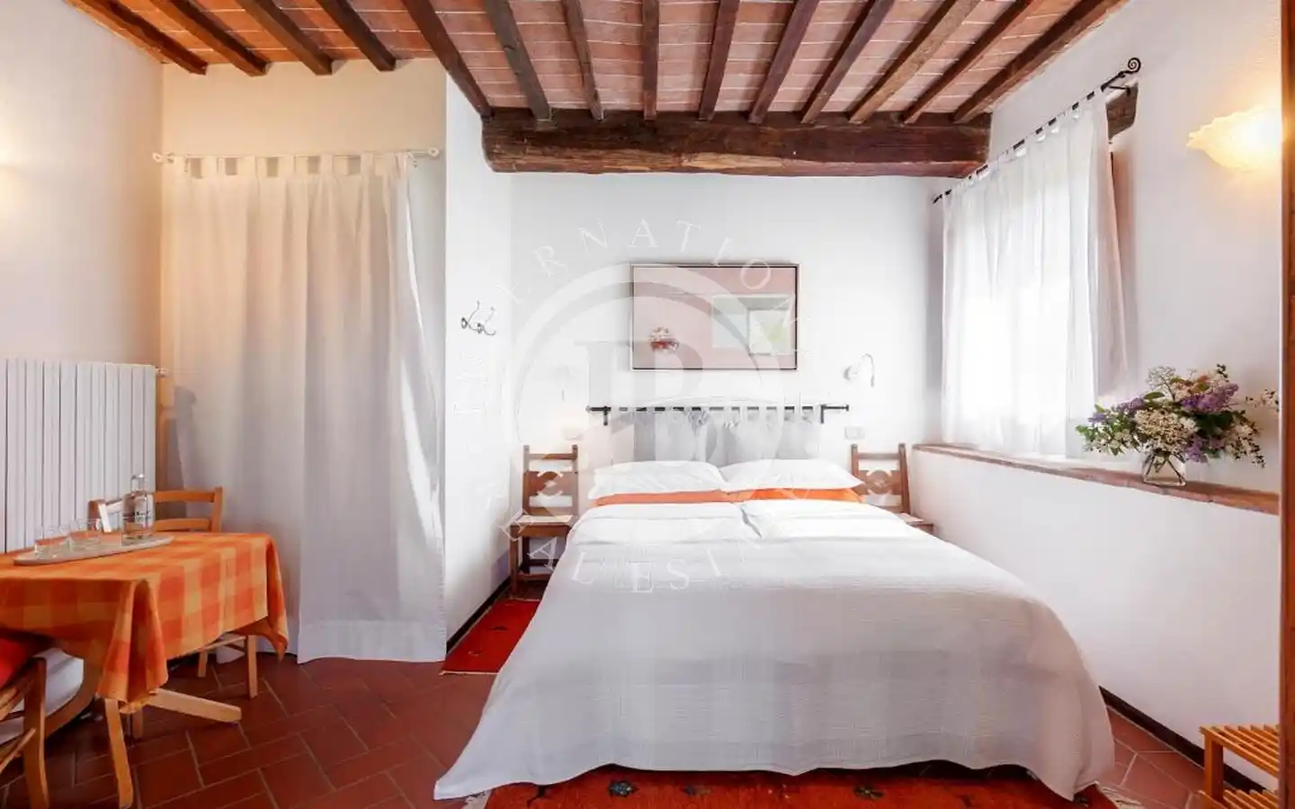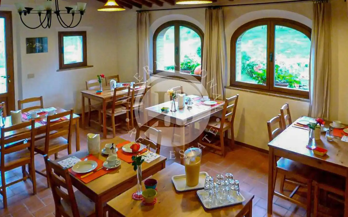 Роскошный фермерский дом расположен на двух гармонично распределенных уровнях. На первом этаже четыре просторных номера, каждый с отдельной ванной комнатой и эксклюзивной террасой, в настоящее время используются для проживания на ферме.