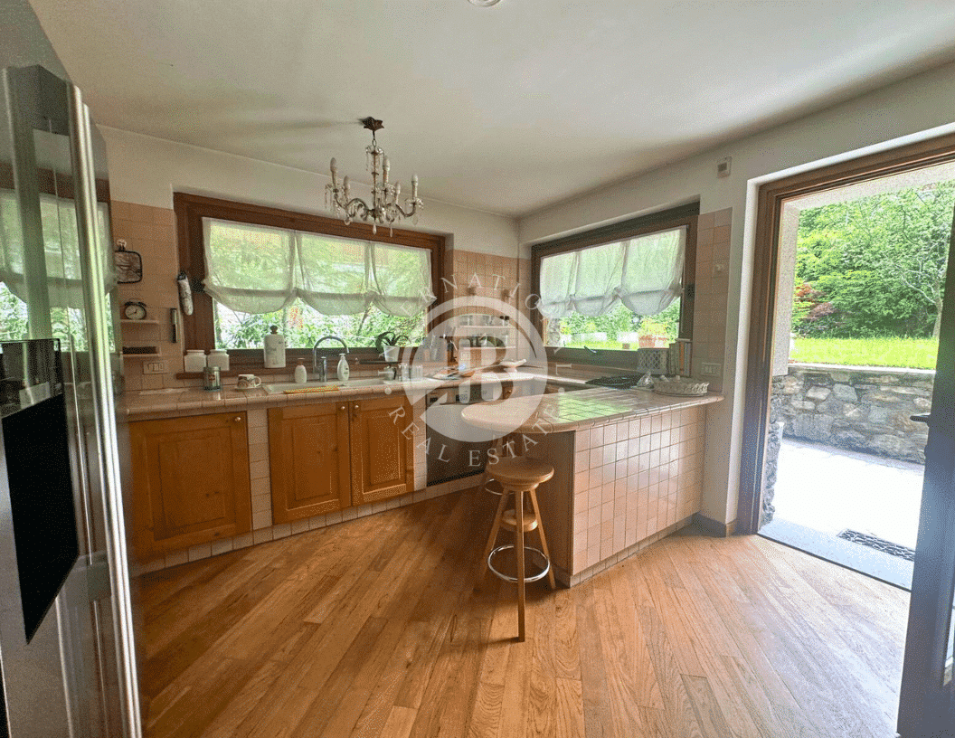 da zona giorno con finestre panoramiche, una sala da pranzo collegata ad un'incantevole cucina con accesso diretto al giardino.